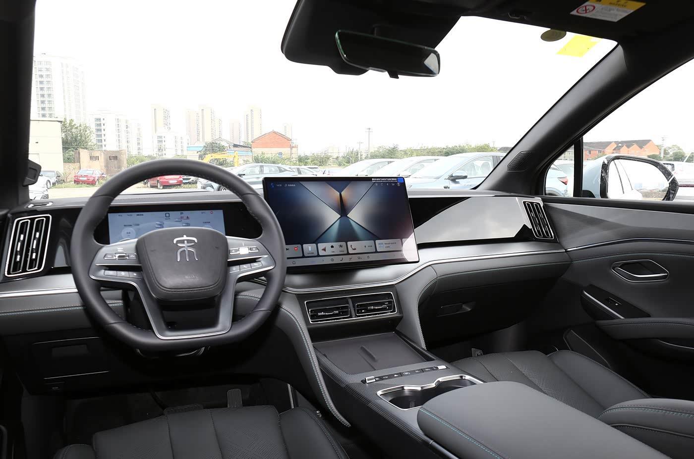 进入车内,新车采用苍穹环抱式座舱设计,中控台15.6英寸2.5K旋转屏搭载DiLink 5.0系统,支持5G车联网。怀挡设计释放的中央通道被重构为智能生活区,50W无线快充板支持风冷散热,下层抽屉式储物格可容纳折叠伞。座椅采用Nappa真皮+环保麂皮双拼材质,坐垫硬度经过500次人体工学测试,长途驾驶腰部压力降低,乘坐感受更加的舒适。